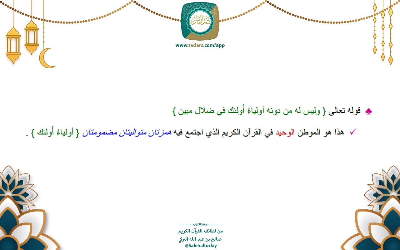 - هذا هو الموطن الوحيد في القرآن الكريم الذي اجتمع فيه همزتان متواليتان مضمومتان { أولياءُ أُولئك } .
