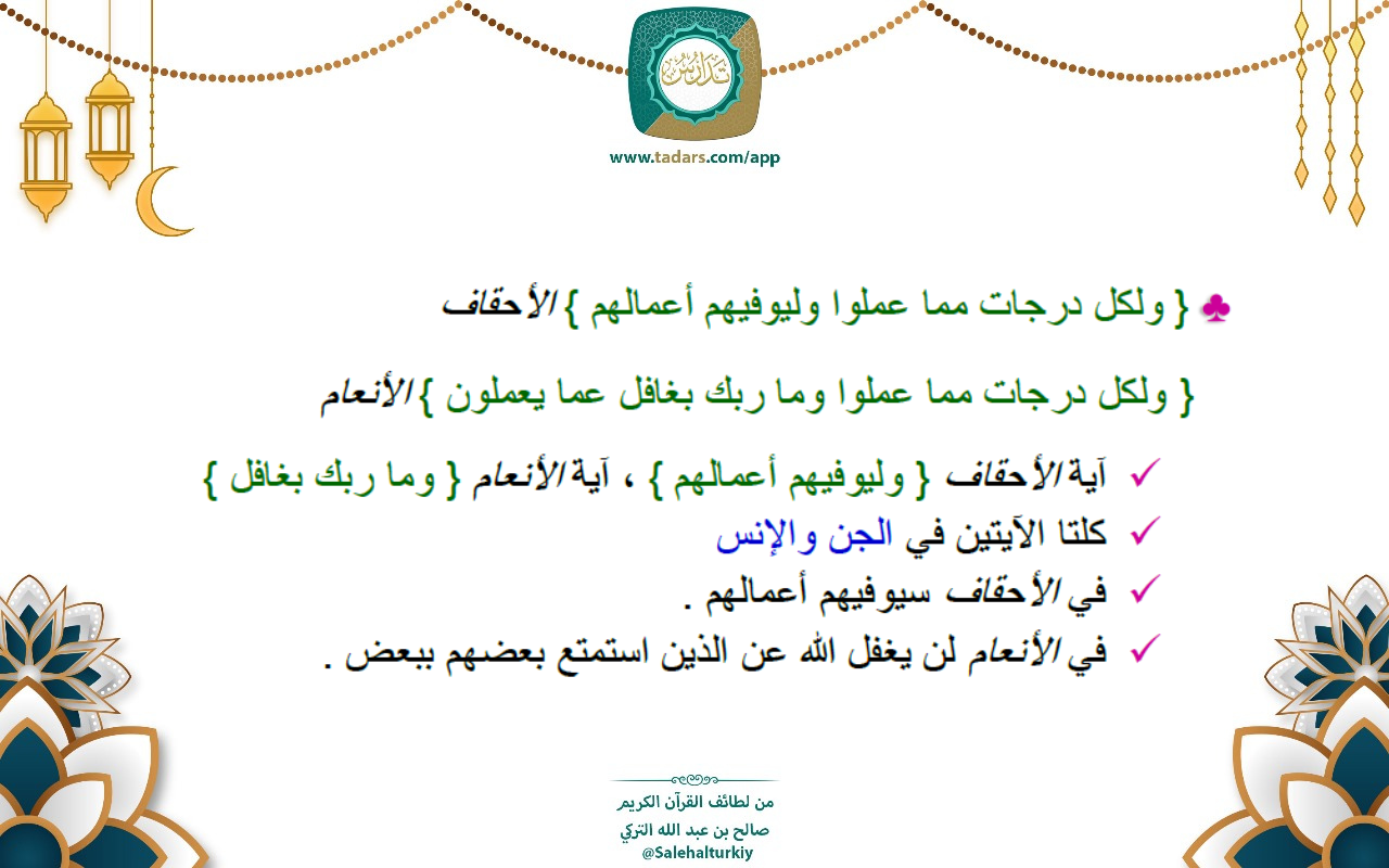 - آية الأحقاف { وليوفيهم أعمالهم } ، آية الأنعام { وما ربك بغافل }