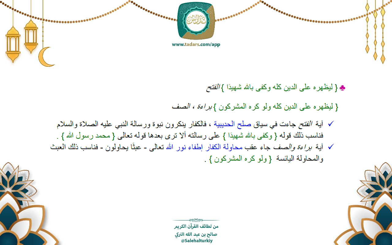 • { ليظهره على الدين كله وكفى بالله شهيدًا } الفتح