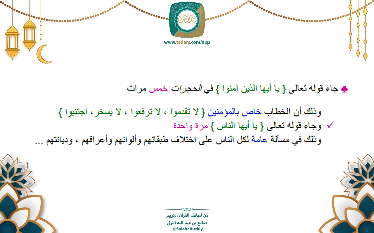 • جاء قوله تعالى { يا أيها الذين آمنوا } في الحجرات خمس مرات