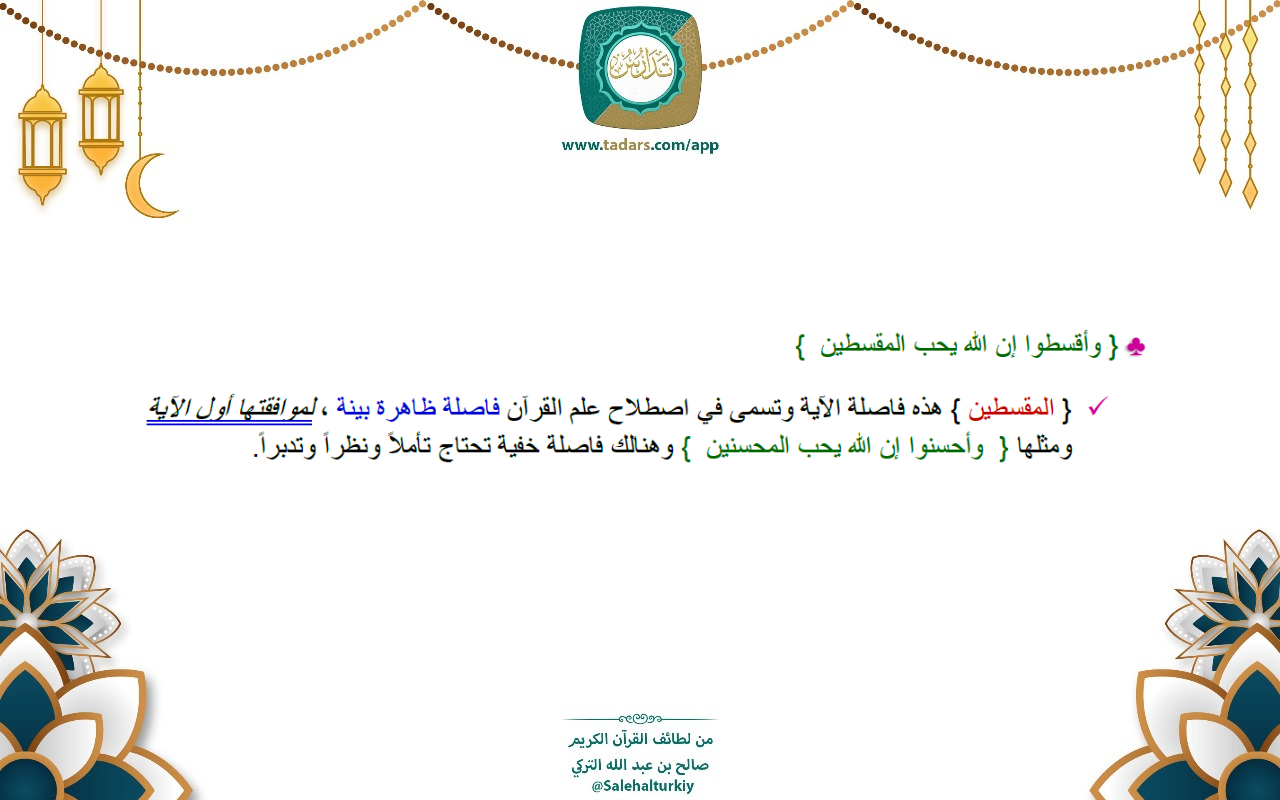 - { المقسطين } هذه فاصلة الآية وتسمى في اصطلاح علم القرآن فاصلة ظاهرة بينة ، لموافقتها أول الآية ومثلها { وأحسنوا إن الله يحب المحسنين } وهنالك فاصلة خفية تحتاج تأملاً ونظراً وتدبراً .