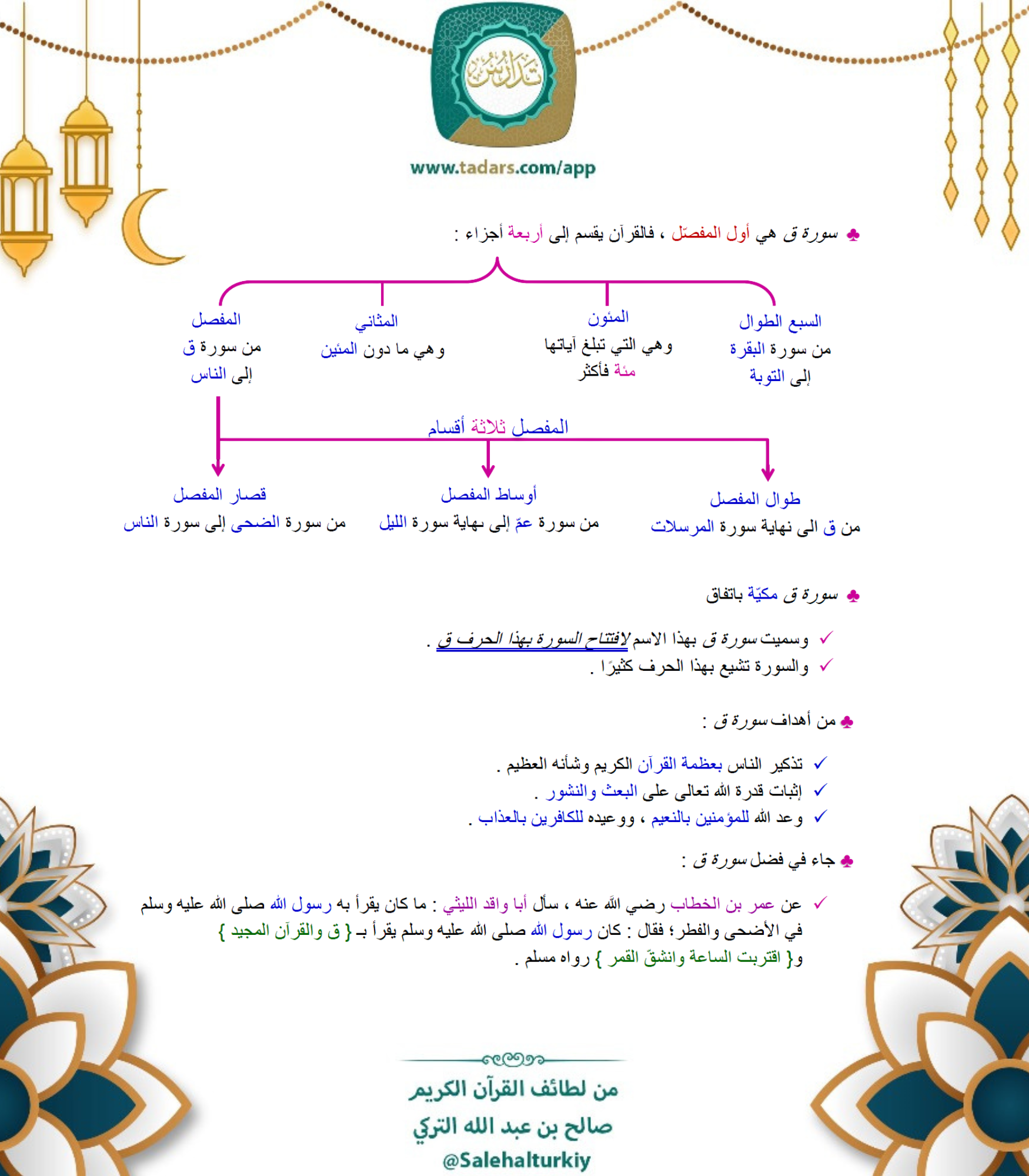• سورة ق هي أول المفصّل ، فالقرآن يقسم إلى أربعة أجزاء :