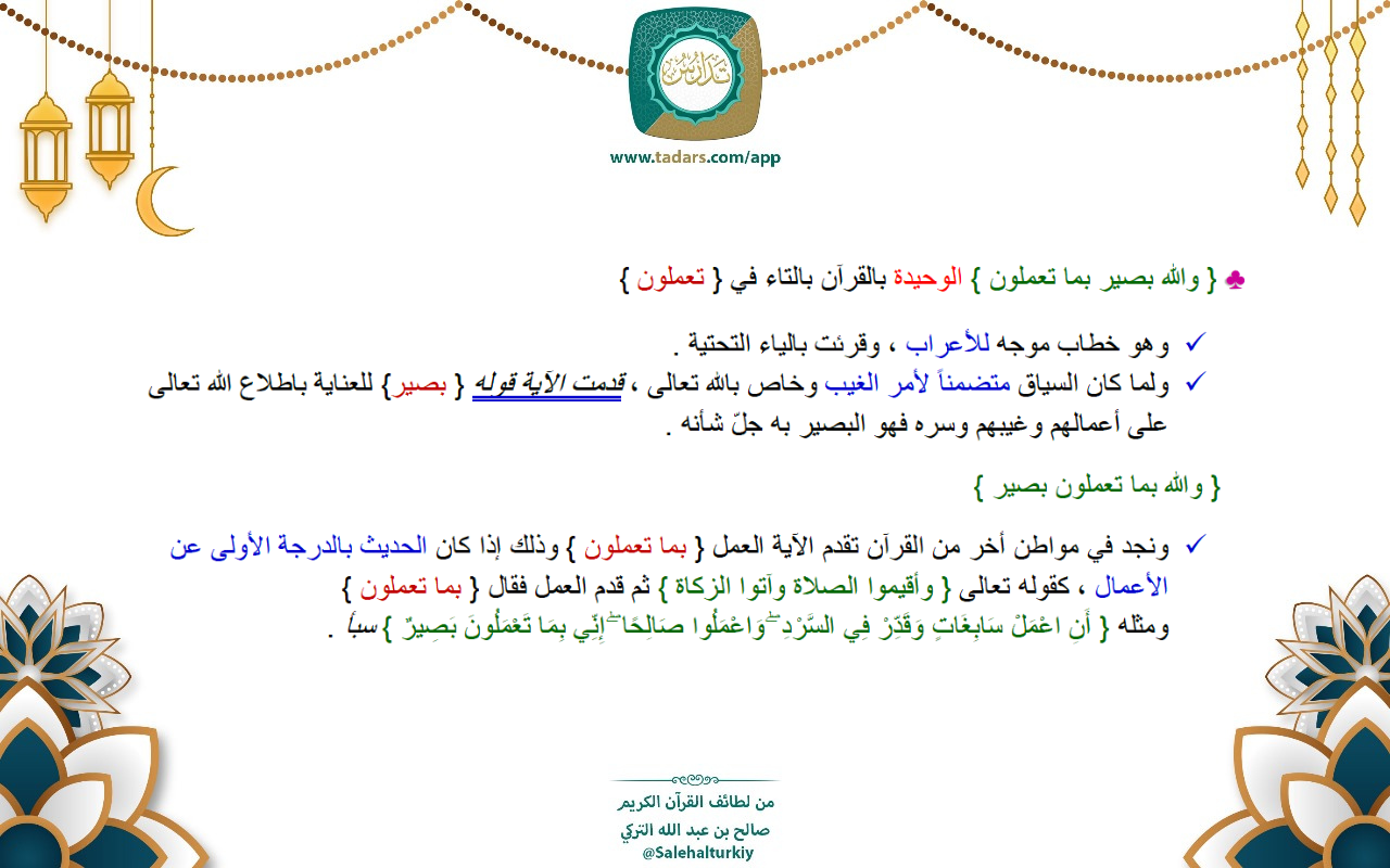 • { والله بصير بما تعملون } الوحيدة بالقرآن بالتاء في { تعملون }
