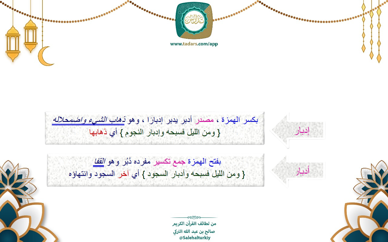 بفتح الهمزة جمع تكسير مفرده دبر وهو القفا { ومن الليل فسبحه وأدبار السجود } أي آخر السجود وانتهاؤه