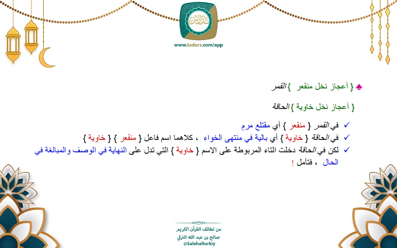 - في الحاقة { خاوية } أي بالية في منتهى الخواء ، كلاهما اسم فاعل { منقعر } { خاوية }