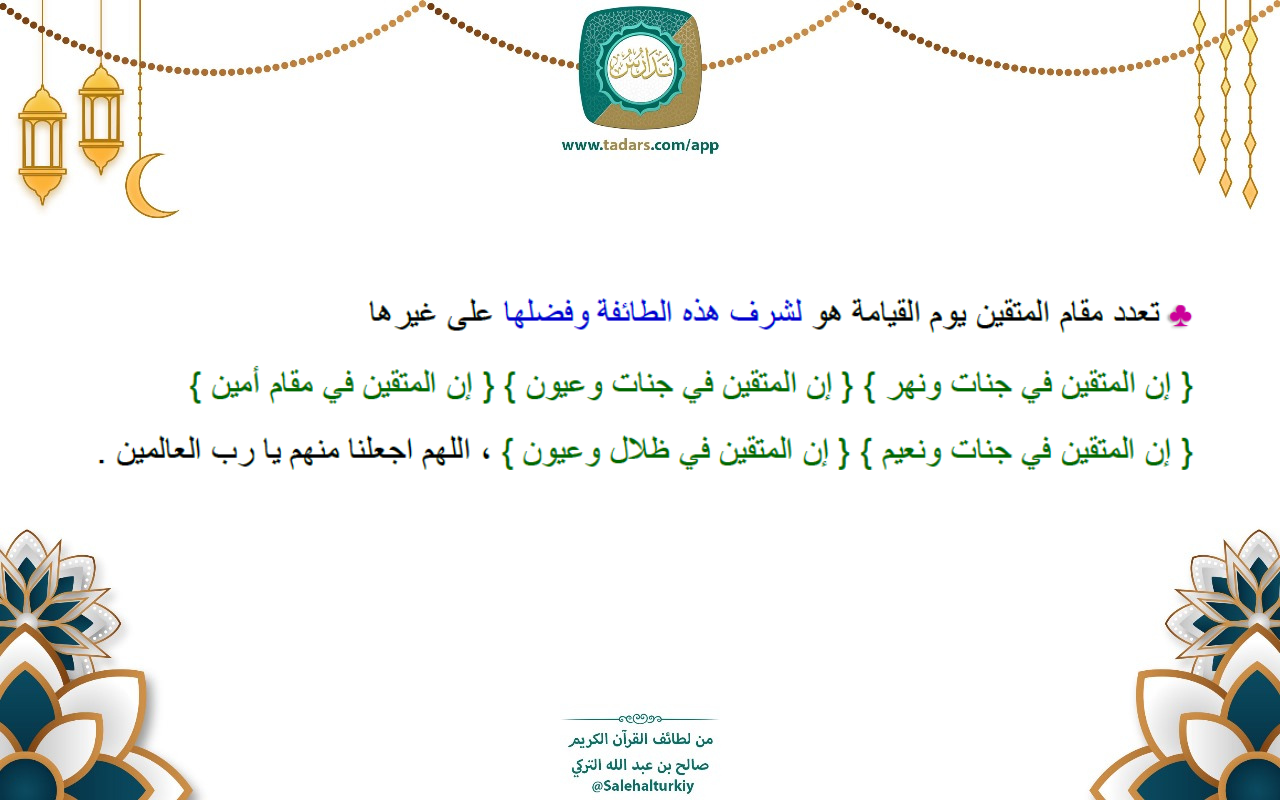 • تعدد مقام المتقين يوم القيامة هو لشرف هذه الطائفة وفضلها على غيرها