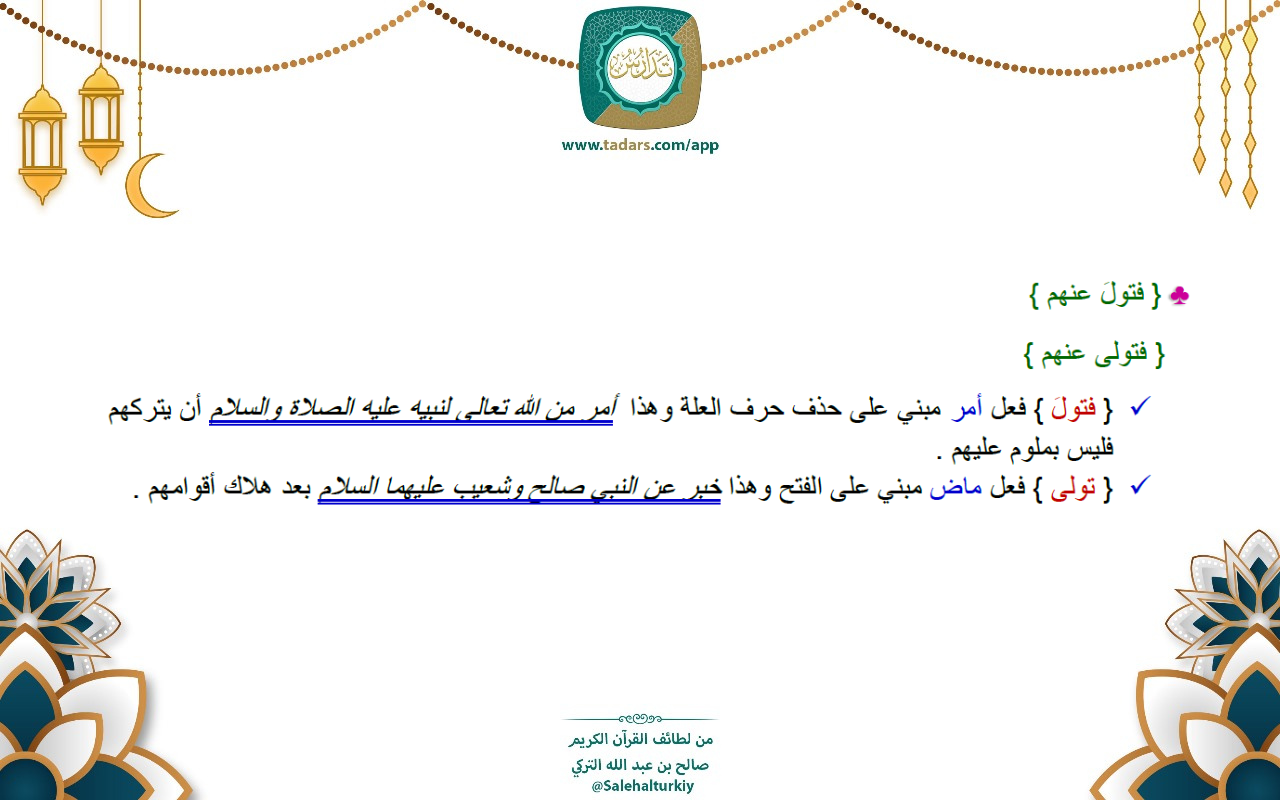 - { فتولَ } فعل أمر مبني على حذف حرف العلة وهذا أمر من الله تعالى لنبيه عليه الصلاة والسلام أن يتركهم فليس بملوم عليهم .