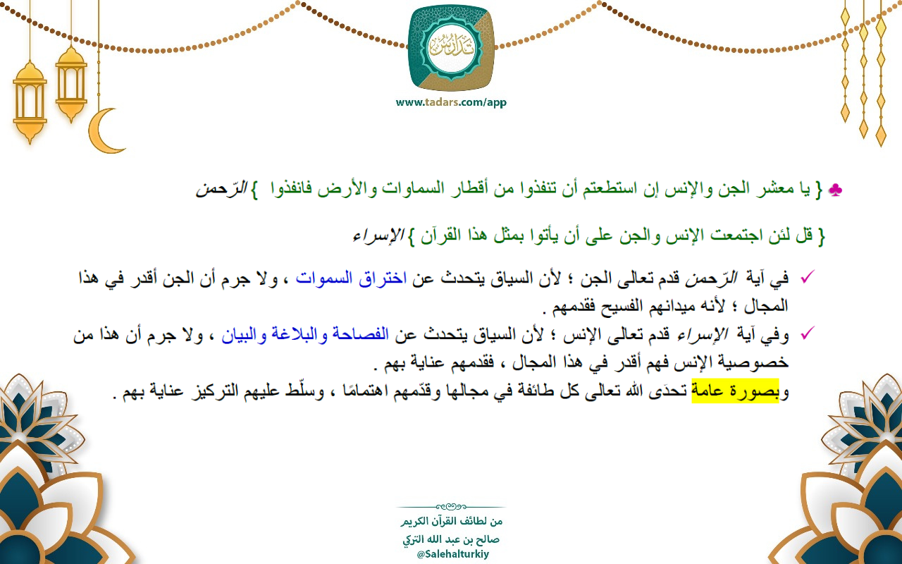 - في آية الرّحمن قدم تعالى الجن ؛ لأن ال... المزيد