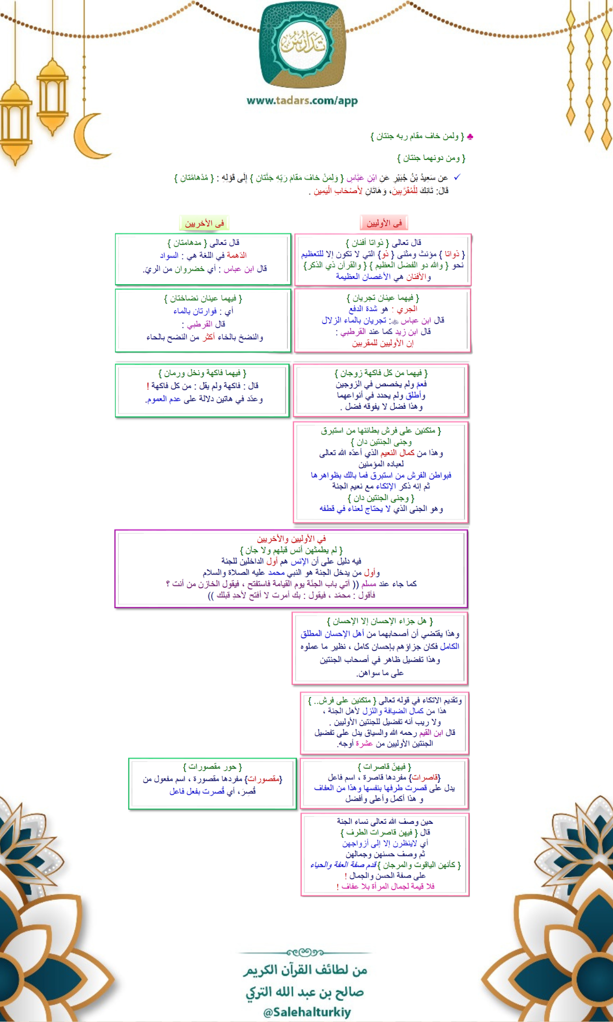 - عن سَعِيدُ بْنُ جُبَيْرٍ عَنِ ابْنِ عَبَّاسٍ { وَلِمَنْ خافَ مَقامَ رَبِّهِ جَنَّتانِ } إِلَى قَوْلِهِ : { مُدْهامَّتانِ }