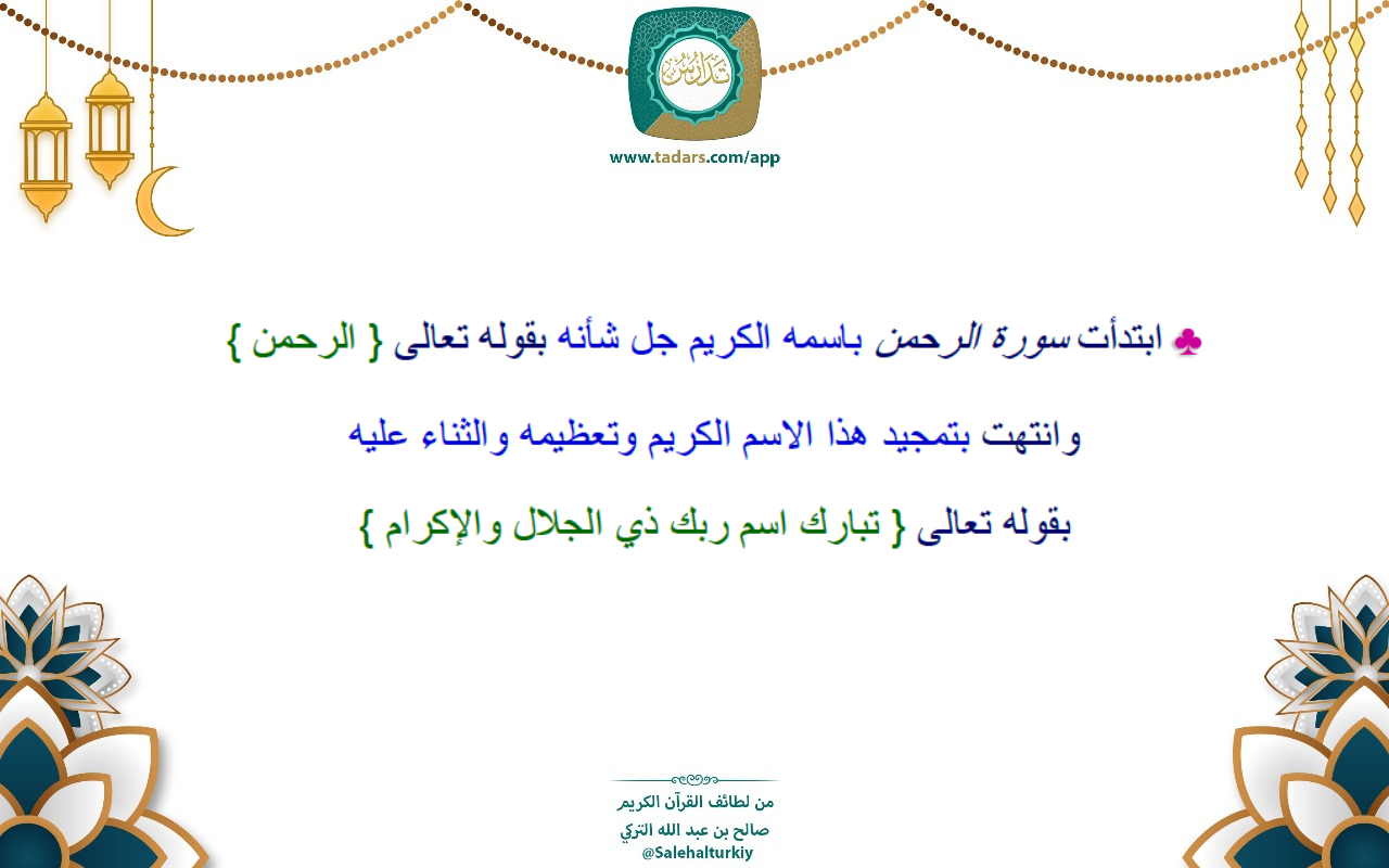 • ابتدأت سورة الرحمن باسمه الكريم جل شأنه بقوله تعالى { الرحمن }