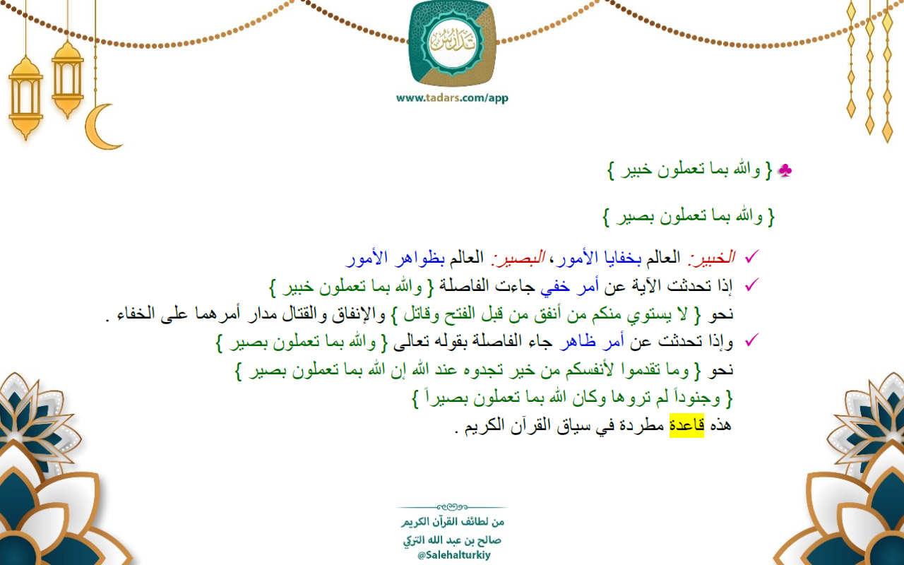- إذا تحدثت الآية عن أمر خفي جاءت الفاصلة { والله بما تعملون خبير }
