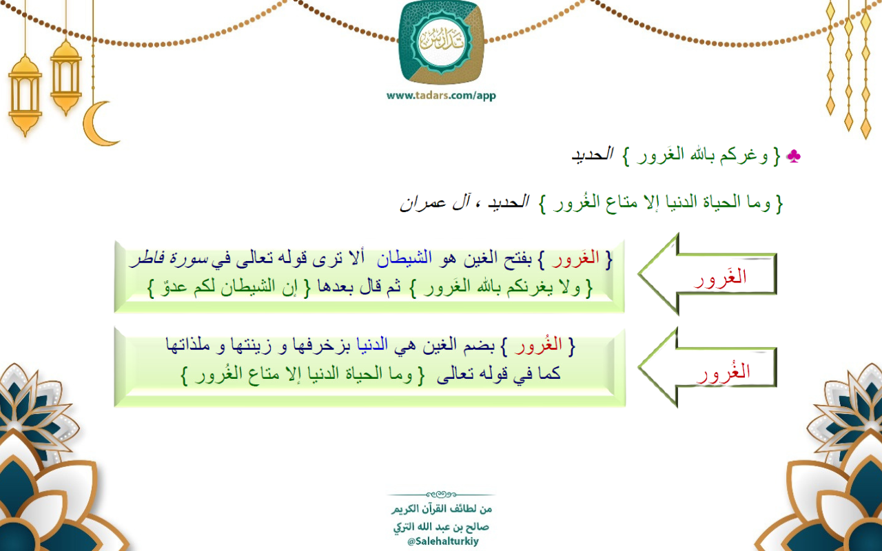 الغرور } بفتح الغين هو الشيطان ألا ترى قوله تعالى في سورة فاطر ولا يغرنكم بالله الغرور } ثم قال... المزيد