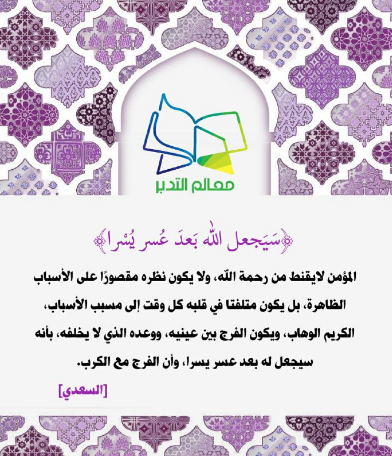 المؤمن لايقنط من رحمة الله، ولا يكون نظره مقصورًا على الأسباب الظاهرة، بل يكون متلفتا فى قلبه كل وقت إلى مسبب الأسباب ، الكريم الوهاب، ويكون الفرج بين عينيه، ووعده الذى لايخلفه، بأنه سيجعل له بعد عسر يسرا، وأن الفرج مع الكرب.