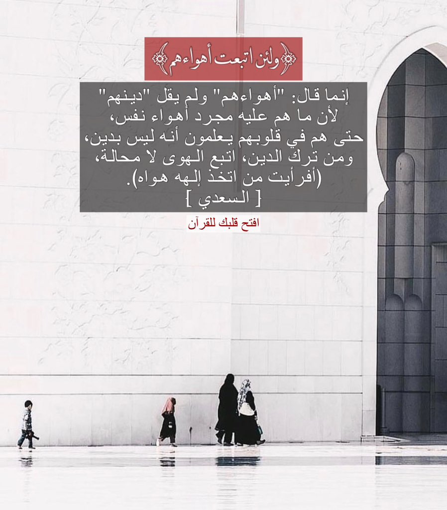 إنما قال: "أهواءهم" ولم يقل "دينهم" لأن ما هم عليه مجرد أهواء نفس، حتى هم في قلوبهم يعلمون أنه ليس بدين، ومن ترك الدين، اتبع الهوى لا محالة، (أفرأيت من اتخذ إلهه هواه).