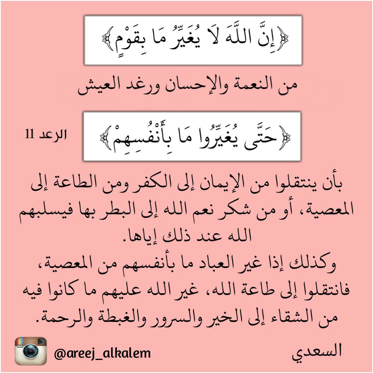 (إِنَّ اللَّهَ لَا يُغَيِّرُ مَا بِقَوْمٍ) من النعمة والإحسان ورغد العيش (حَتَّى يُغَيَّرُوا مَا بِأَنْفُسِهِمْ) بأن ين... المزيد