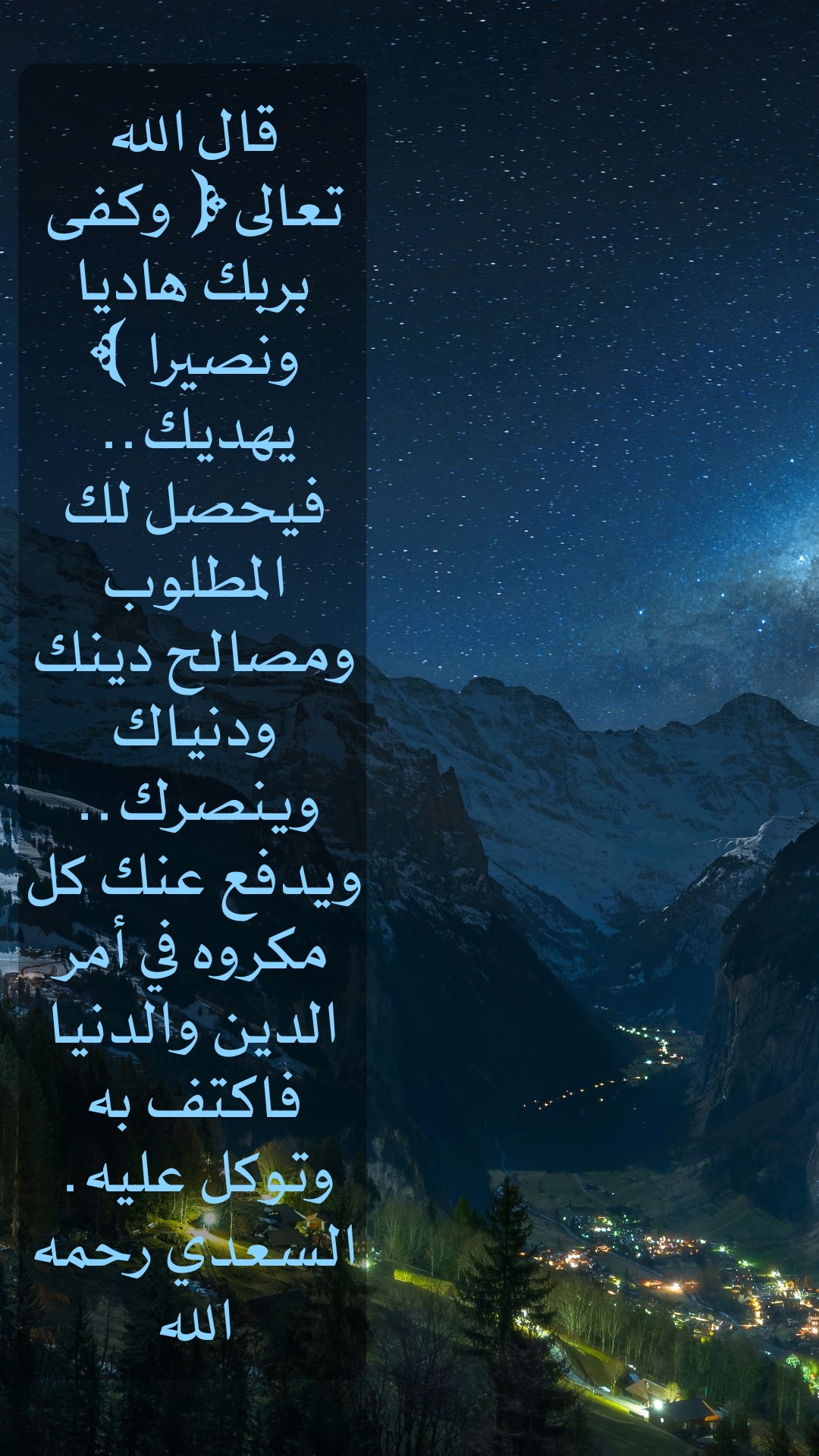 • يهديك فيحصل لك المطلوب ومصالح دينك ودنياك وينصرك ويدفع عنك كل مكروه في أمر الدين والدنيا، فاكتف به وتوكل عليه.