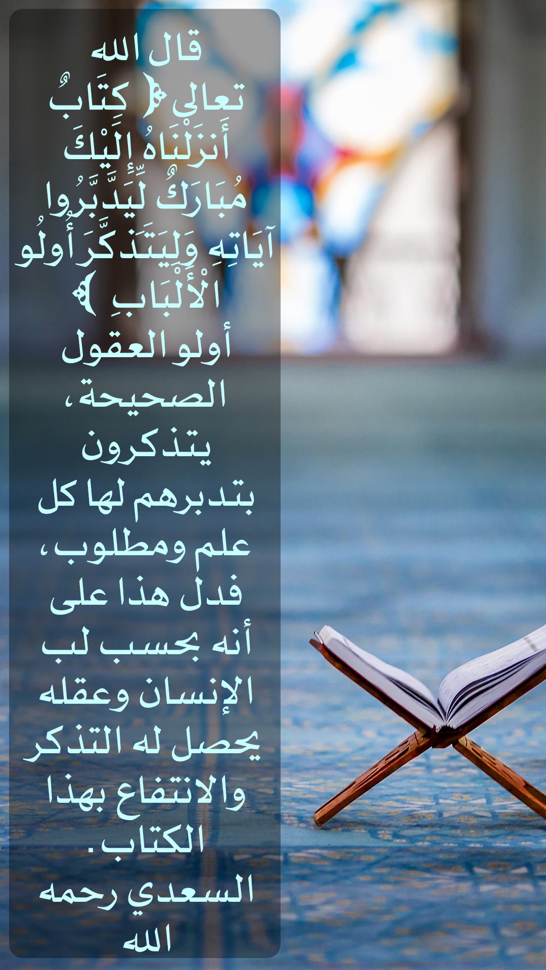 "كِتَابُ أَنزَلْنَاهُ إِلَيْكَ مُبَارَكَ لَيَدَّبَّرُوا آيَاتِهِ وَلِيَتَذَكَّرَ أُولُو الْأَلْبَابِ"