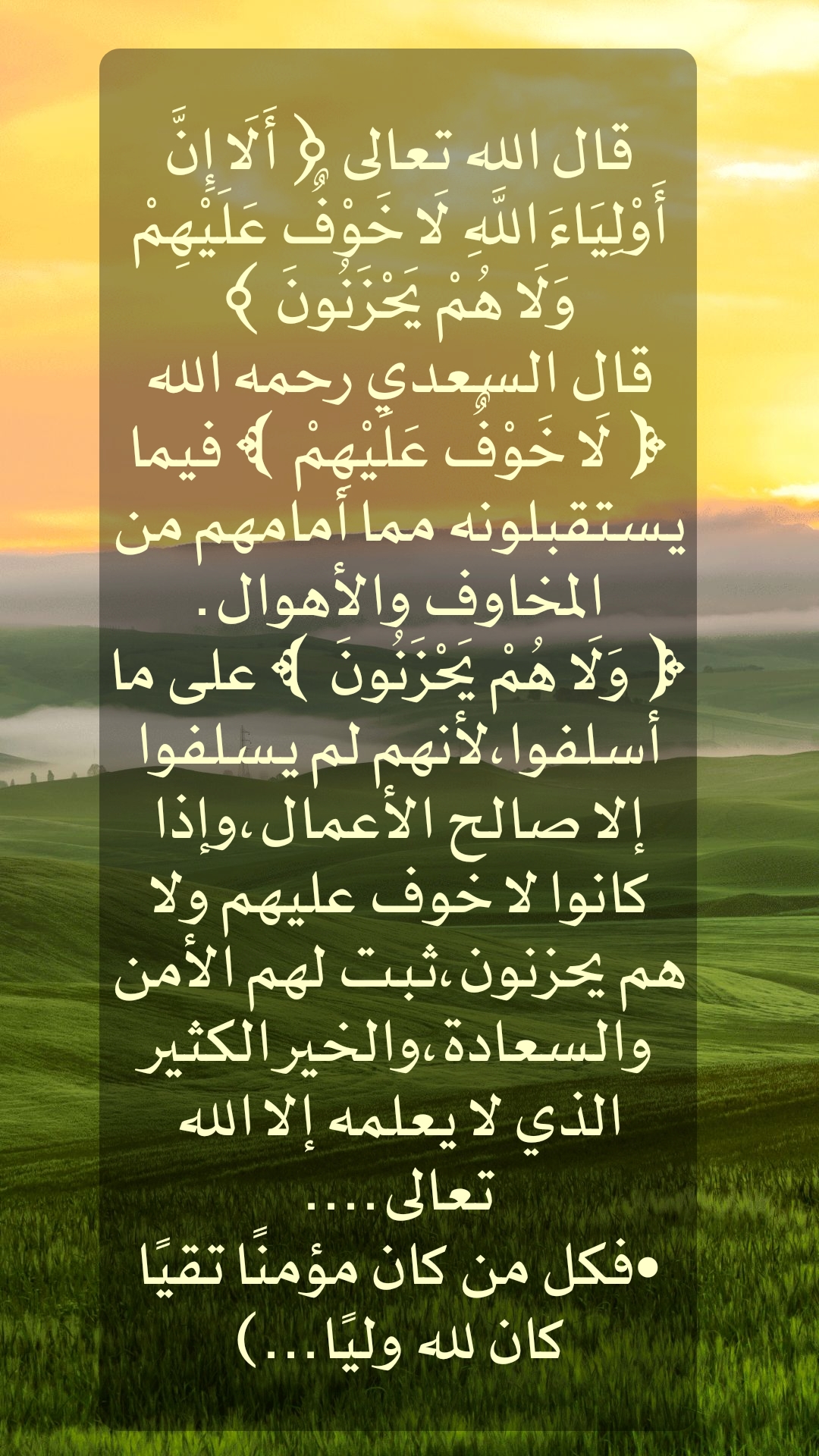 قال الله تعالى ( أَلَا إِنَّ أَوْلِيَاءَ اللَّهِ لَا خَوْفٌ عَلَيْهِمْ وَلَا هُمْ يَحْزَنُونَ ) قال السعدي رحمه الله لَا خَوْفٌ عَلَيْهِمْ ﴾ فيما يستقبلونه مما أمامهم من المخاوف والأهوال وَلَا هُمْ يَ... المزيد