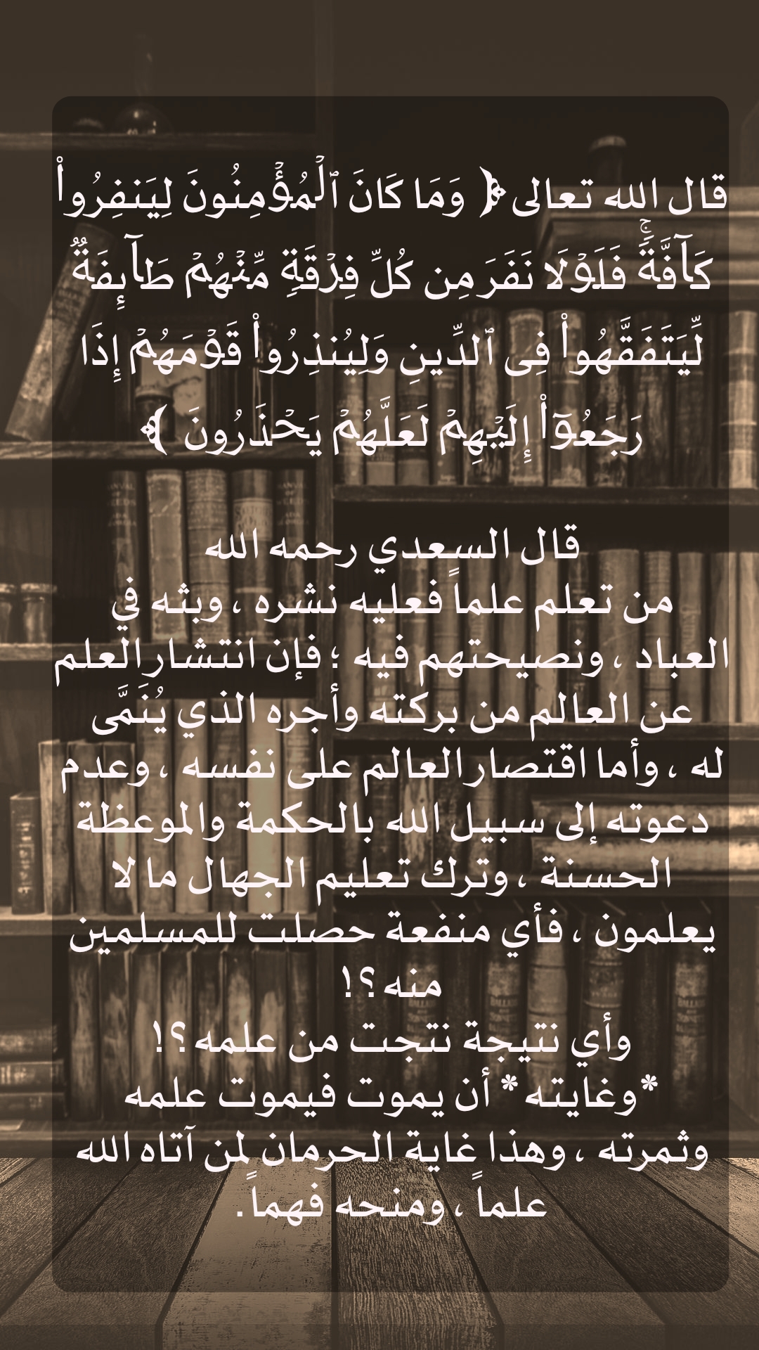 قال الله تعالى ( وَمَا كَانَ الْمُؤْمِنُونَ لِيَنفِرُوا كَافَّةً فَلَوْلَا نَفَرَ مِن كُلِّ فِرْقَةٍ مِّنْهُمْ طَائِفَةٌ ليَتَفَقَّهُوا فِي الدِّينِ وَلِيُنذِرُوا قَوْمَهُمْ إِذَا رَجَعُوا إِلَيْهِمْ ... المزيد