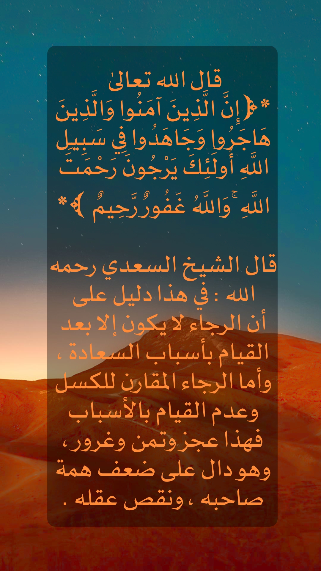 قال الله تعالى ( إِنَّ الَّذِينَ آمَنُوا وَالَّذِينَ هَاجَرُوا وَجَاهَدُوا فِي سَبِيلِ الله أولَئِكَ يَرْجُونَ رَحْمَتَ اللهِ وَاللَّهُ غَفُورٌ رَّحِيمُ )*