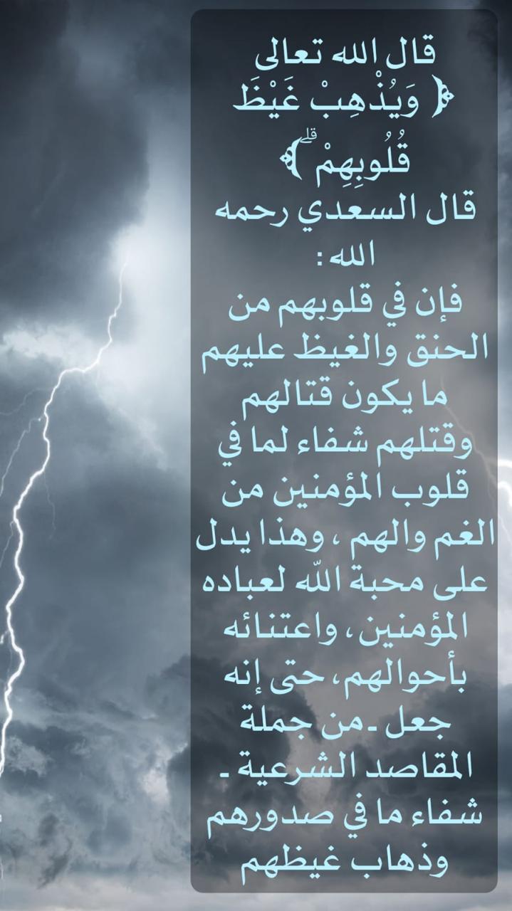 فإن في قلوبهم من الحنق والغيظ عليهم ما يكون قتالهم وقتلهم شفاء لما في قلوب المؤمنين من الغم والهم ، وهذا يدل على محبة الله لعباده المؤمنين، واعتنائه بأحوالهم، حتى إنه جعل -من جملة المقاصد الشرعية- شفاء ما في صدورهم وذهاب غيظهم."