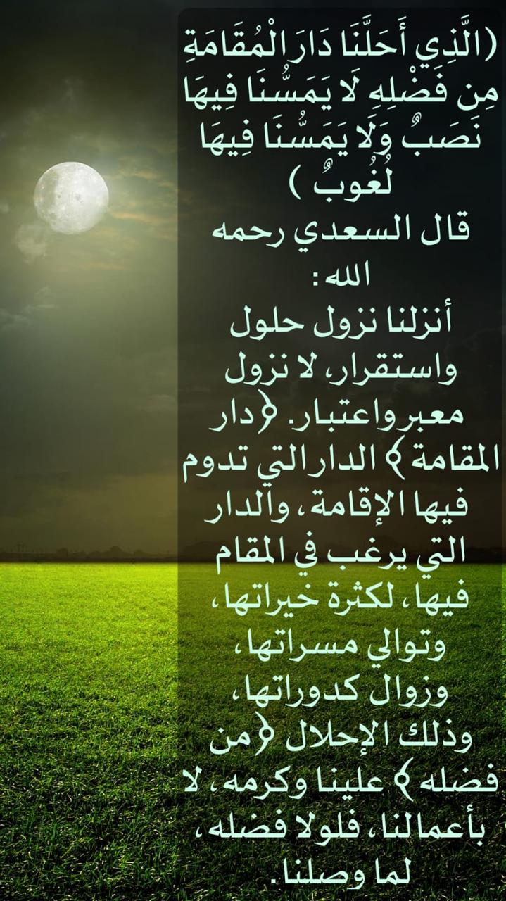﴿الَّذِي أَحَلَّنَا دَارَ الْمُقَامَةِ مِن فَضْلِهِ لَا يَمَسُّنَا فِيهَا نَصَبٌ وَلَا يَمَسُّنَا فِيهَا لُغُوبٌ﴾