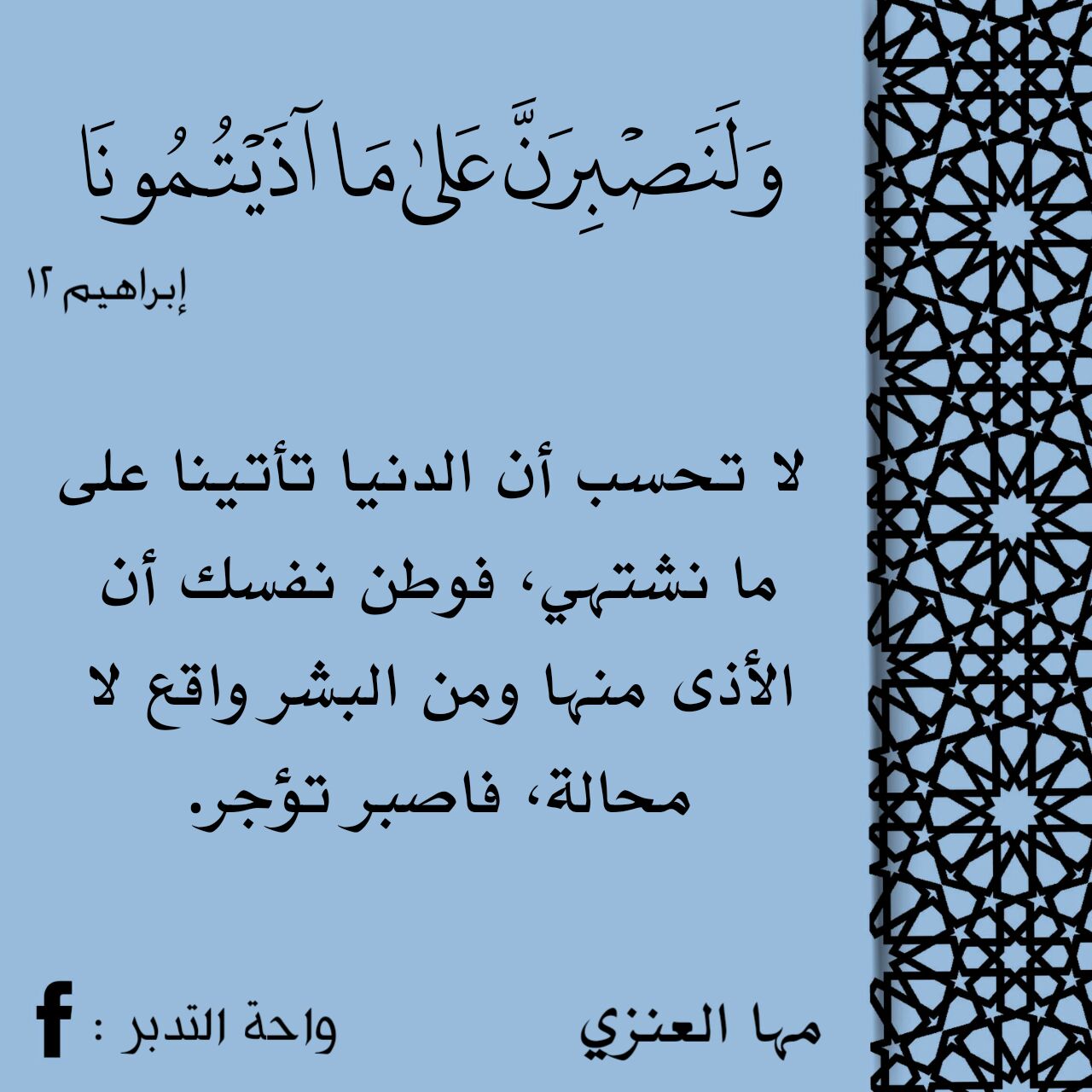 لا تحسب أن الدنيا تأتينا على ما نشتهي، فوطن نفسك أن الأذى منها ومن البشر واقع لا محالة، فاصبر تؤجر.