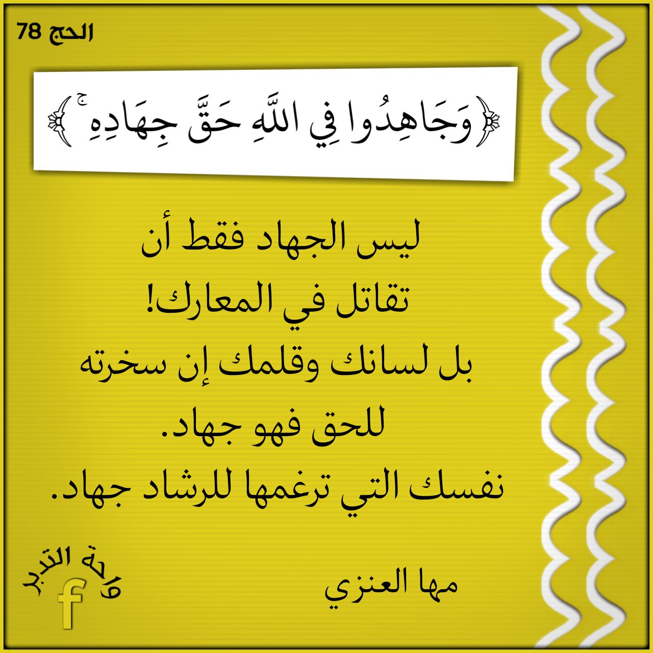 ليس الجهاد فقط أن تقاتل في المعارك! بل لسانك وقلمك إن سخرته للحق فهو جهاد. نفسك التي ترغمها للرشاد جهاد.