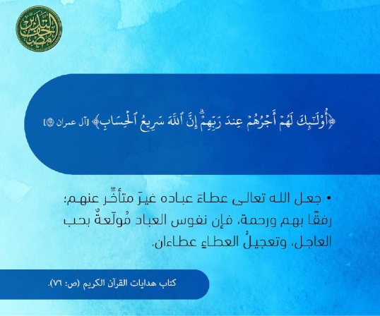 • جعل الله تعالى عطاءَ عباده غيرَ متأخِّر عنهم؛ رفقًا بهم ورحمة، فإن نفوس العباد مُولَعةٌ بحب العاجل، وتعجيلُ العطاءِ عطاءان.