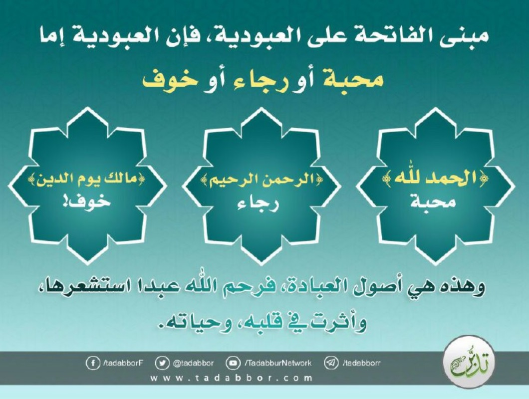 مبنى الفاتحة على العبودية، فإن العبودية إما محبة أو رجاء أو خوف