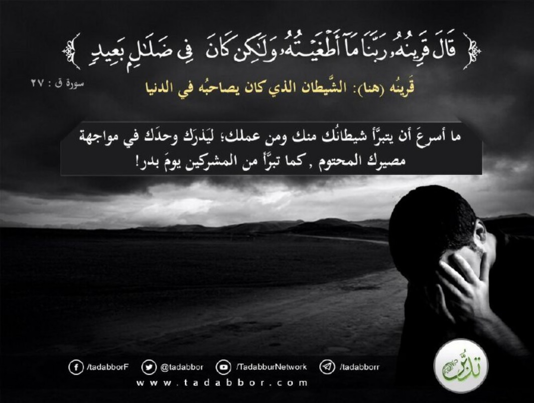 ﴿ قَالَ قَرِينُهُ رَبَّنَا مَا أَطْغَيْتُهُ وَلَكِن كَانَ فِي ضَلَالٍ بَعِيدٍ ﴾