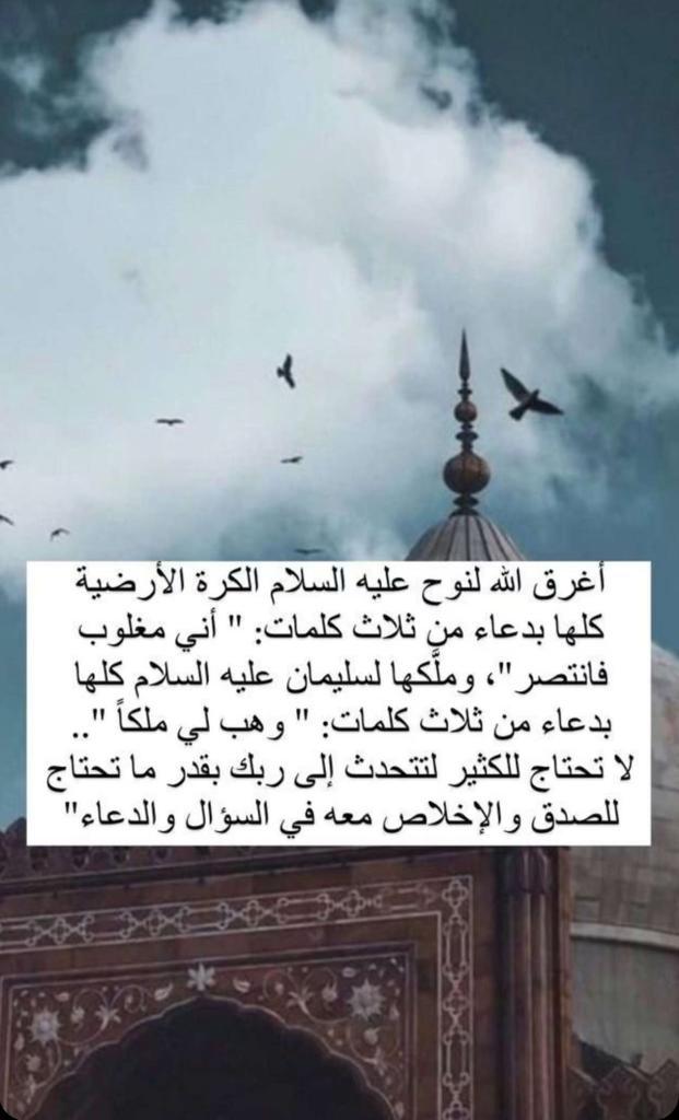 أغرق الله لنوح عليه السلام الكرة الأرضية كلها بدعاء من ثلاث كلمات: "أني مغلوب فانتصر"، وملَّكها لسليمان عليه السلام كلها بدعاء من ثلاث كلمات: "وهب لي ملكاً "... لا تحتاج للكثير لتتحدث إلى ربك بقدر ما تحتاج للصدق والإخلاص معه في السؤال والدعاء.