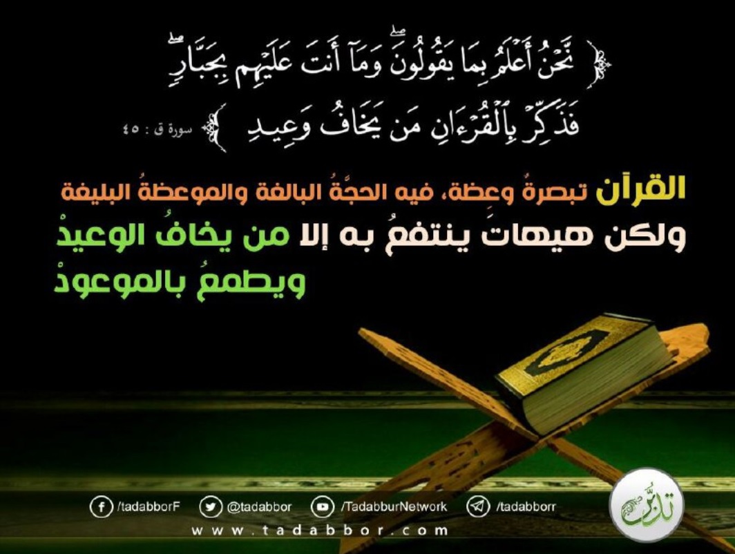 القرآن تبصرةٌ وعِظة، فيه الحجّةُ البالغة والموعظة البليغة، ولكن هيهـاتَ أن ينتفـعَ به إلا مـن يخـافُ الوعيـدْ، ويطـمـعُ بالموعـودْ.