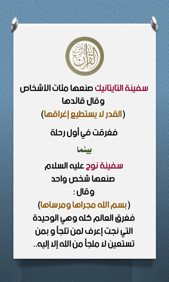 سفينة التايتانيك صنعها مئات الأشخاص؛ وقال قائدها: (القدر لا يستطيع إغراقها) فغرقت في أول رحلة