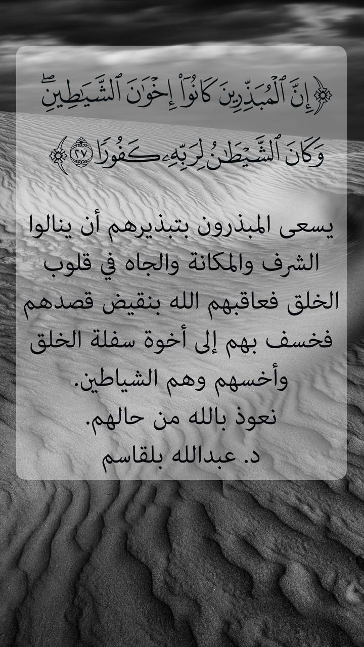 ﴿إِنَّ ٱلۡمُبَذِّرِینَ كَانُوۤا۟ إِخۡوَ ٰنَ ٱلشَّیَـٰطِینِۖ وَكَانَ ٱلشَّیۡطَـٰنُ لِرَبِّهِۦ كَفُورࣰا ٢٧﴾