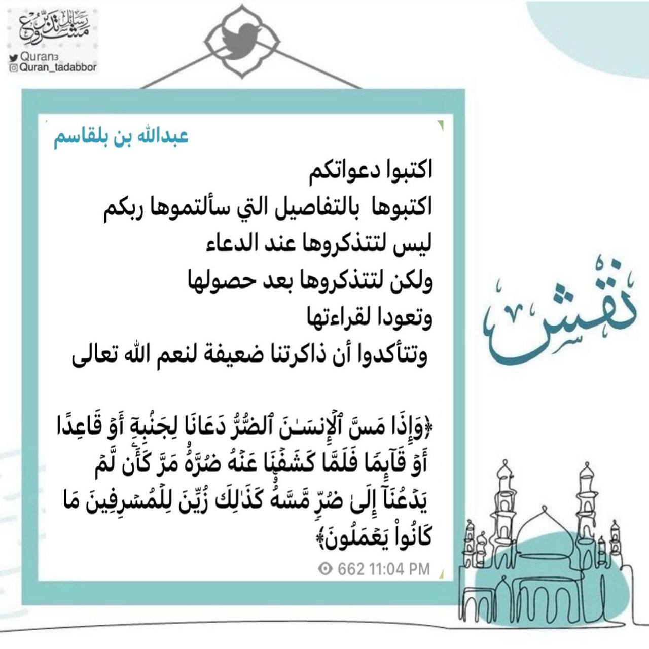 ليس لتتذكروها عند الدعاء، ولكن لتتذكروها بعد حصولها، وتعودا لقراءتها وتتأكدوا أن ذاكرتنا ضعيفة لنعم الله تعالى