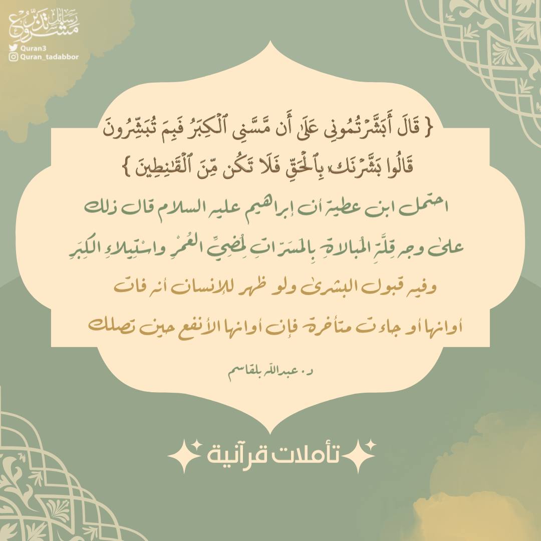 { قَالَ أَبَشَّرۡتُمُونِی عَلَىٰۤ أَن مَّسَّنِیَ ٱلۡكِبَرُ فَبِمَ تُبَشِّرُونَ . قَالُوا۟ بَشَّرۡنَـٰكَ بِٱلۡحَقِّ فَلَا تَكُن مِّنَ ٱلۡقَـٰنِطِینَ }