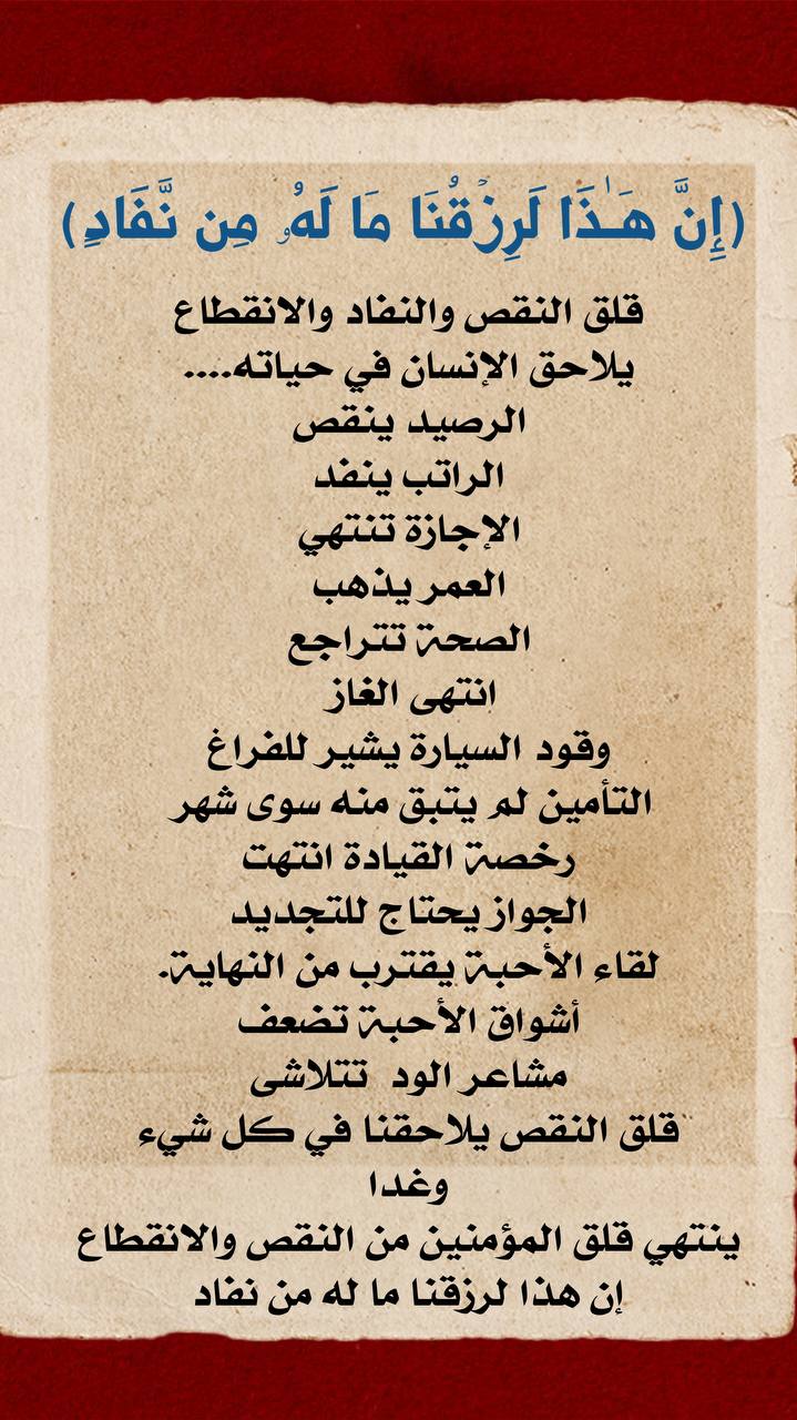 قلق النقص والنفاد والانقطاع يلاحق الإنسان في حياته....