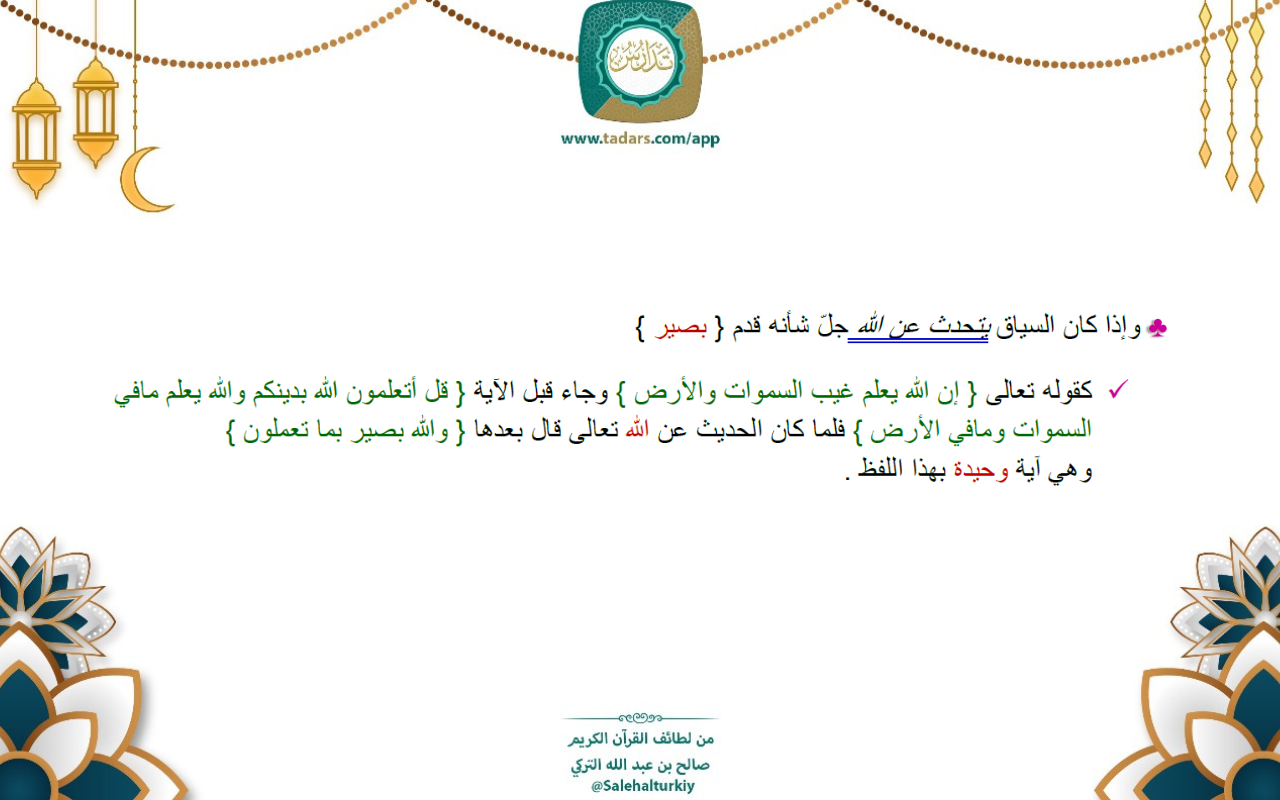 - كقوله تعالى { إن الله يعلم غيب السموات والأرض } وجاء قبل الآية { قل أتعلمون الله بدينكم والله يعلم مافي السموات ومافي الأرض } فلما كان الحديث عن الله تعالى قال بعدها { والله بصير بما تعملون }