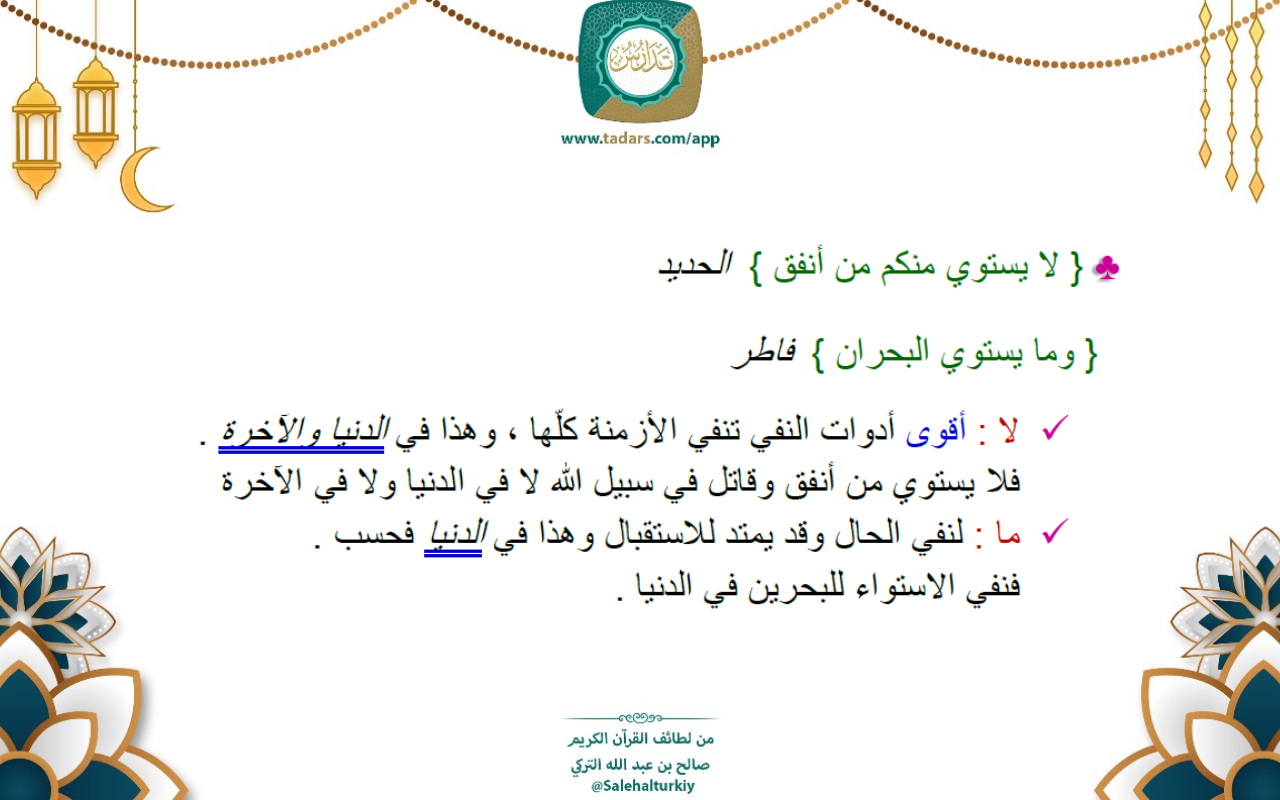 - لا : أقوى أدوات النفي تنفي الأزمنة كلّها ، وهذا في الدنيا والآخرة .