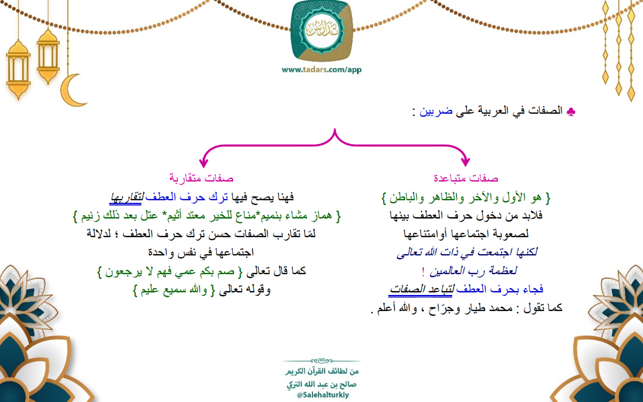 هو الأول والآخر والظاهر والباطن } فلابد من دخول حرف العطف بينها الصعوبة اجتماعها أو امتناعها لكنها اجتمعت في ذات الله تعالى لعظمة رب العالمين !