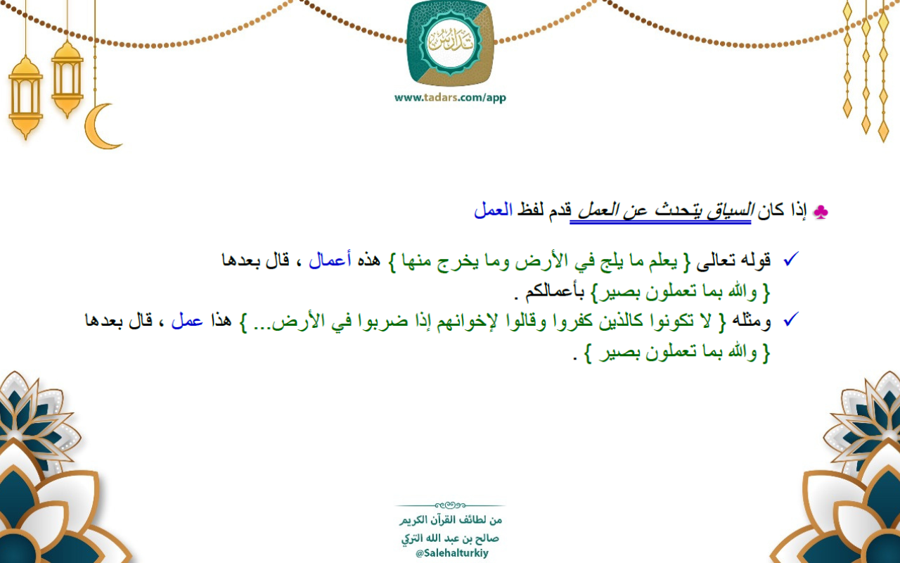 • إذا كان السياق يتحدث عن العمل قدم لفظ العمل