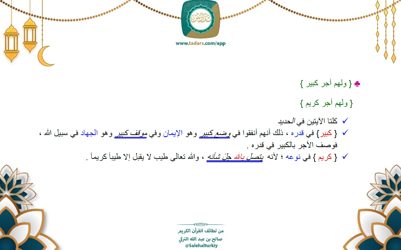- { كبير} في قدره ، ذلك أنهم أنفقوا في وضع كبير وهو الإيمان وفي موقف كبير وهو الجهاد في سبيل الله ، فوصف الأجر بالكبير في قدره .