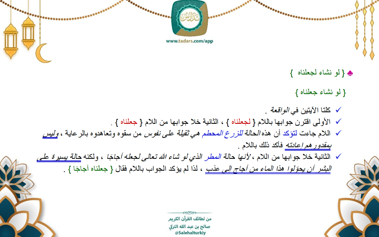 - الثانية خلا جوابها من اللام ، لأنها حالة المطر الذي لو شاء الله تعالى لجعله أجاجًا ، ولكنه حالة يسيرة على البشر أن يحوّلوا هذا الماء من أجاج إلى عذب ، لذا لم يؤكد الجواب باللام فقال { جعلناه أجاجًا } .