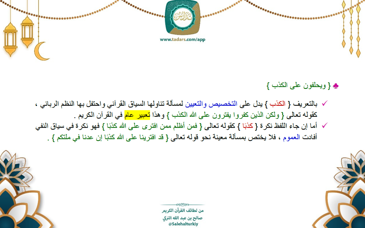 - بالتعريف { الكذب } يدل على التخصيص والتعيين لمسألة تناولها السياق القرآني واحتفل بها النظم الرباني ، كقوله تعالى { ولكن الذين كفروا يفترون على الله الكذب } وهذا تعبير عام في القرآن الكريم .