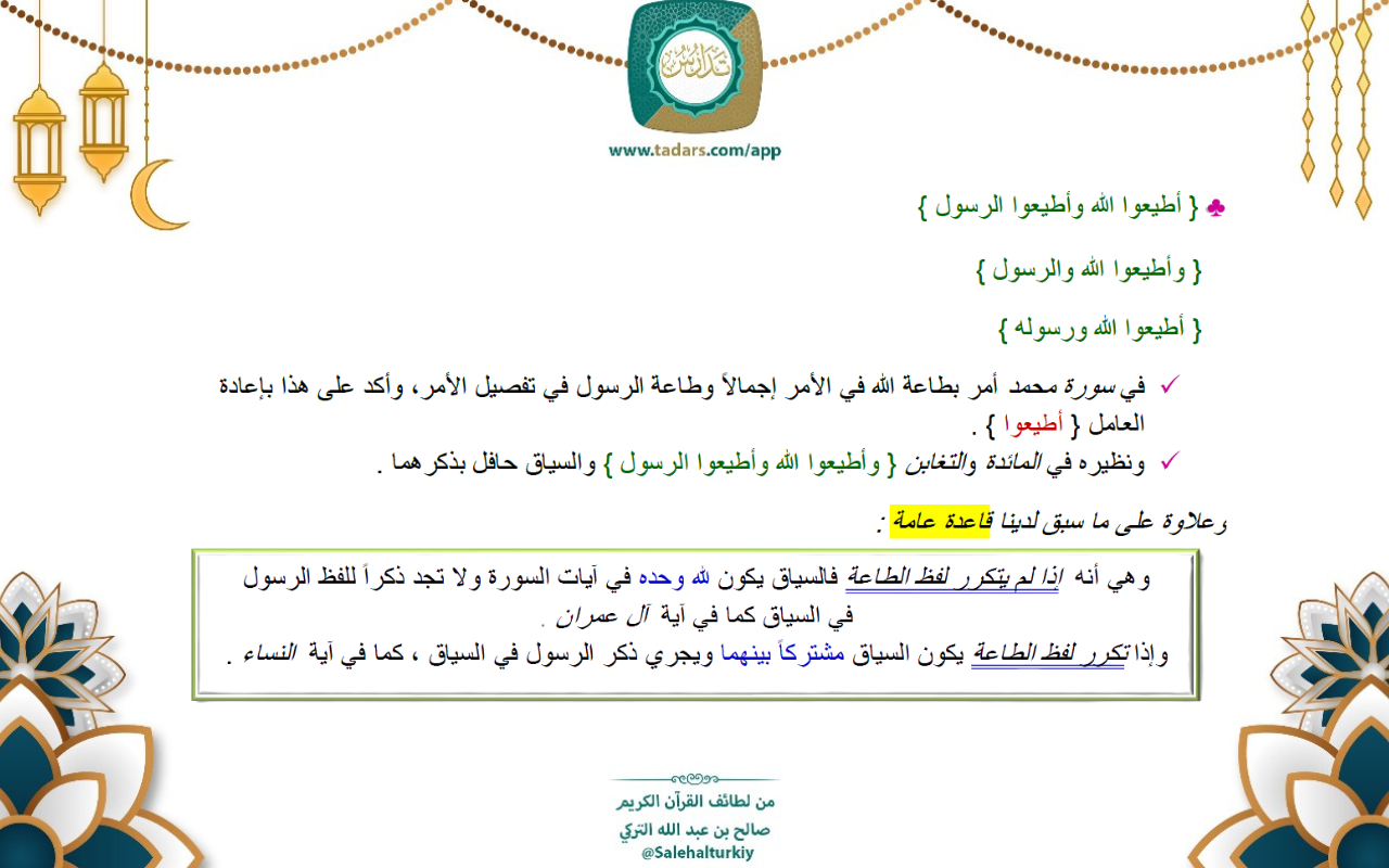 - الطاعة لله تعالى وطاعة الرسول تابعة لطاعة الله ، كما في آل عمران .