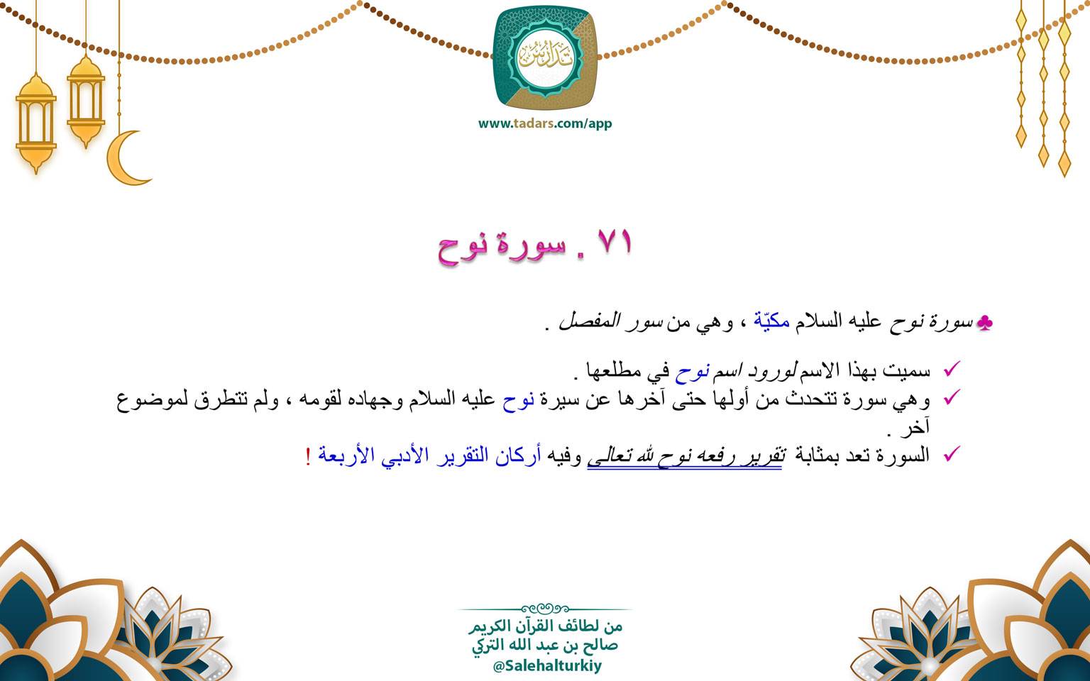 • السورة تعد بمثابة تقرير رفعه نوح لله تعالى وفيه أركان التقرير الأدبي الأربعة !