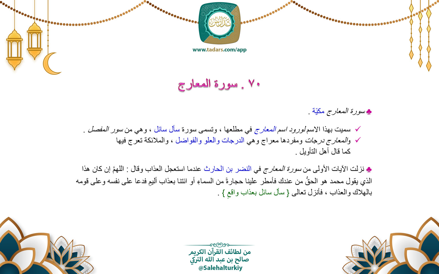 • سميت بهذا الاسم لورود اسم المعارج في مطلعها ، وتسمى سورة سأل سائل ، وهي من سور المفصل .