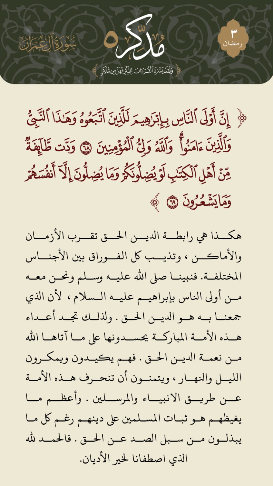 • هكذا هي رابطة الدين الحق تقرب الأزمان والأماكن، وتذيب كل الفوراق بين الأجناس المختلفة، فنبينا صلى الله عليه وسلم ونحن معه من أولى الناس بإبراهيم عليه السلام ، لأن الذي جمعنا به هو الدين الحق، ولذلك تجد أعداء هذه الأمة المباركة يحسدونها على ما آتاها الله من نعمة الدين الحق، فهم يكيدون ويمكرون الليل والنهار، ويتمنون أن تنحرف هذه الأمة عن طريق الأنبياء والمرسلين .