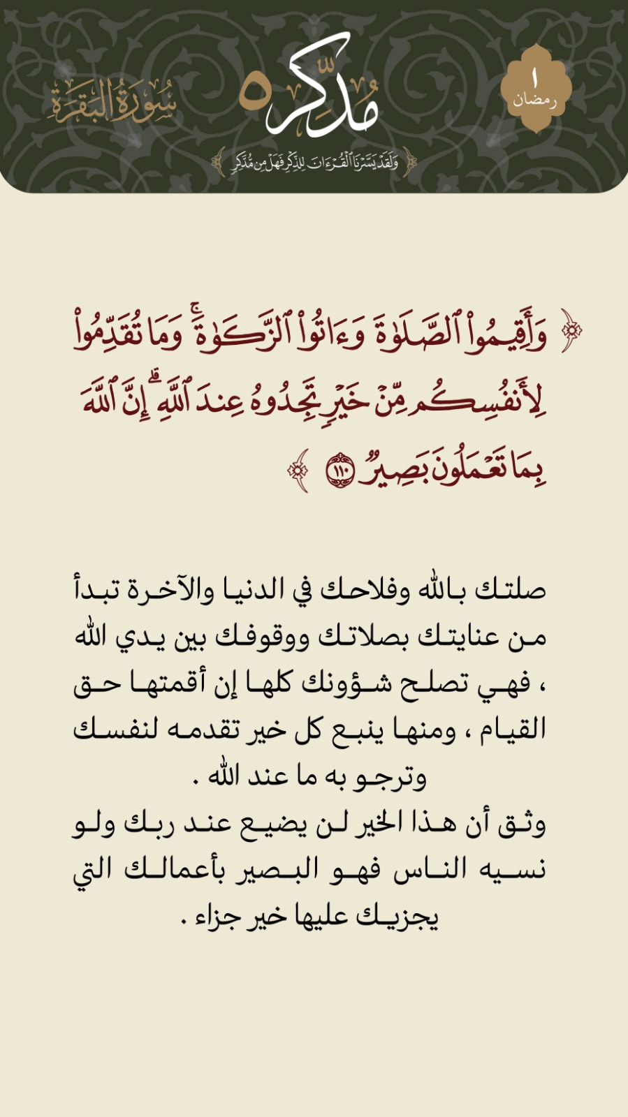 ﴿وَأَقِيمُوا الصَّلَاةَ وَآتُوا الزَّكَاةَ وَمَا تُقَدِّمُوا لِأَنفُسِكُم مِّنْ خَيْرٍ تَجِدُوهُ عِندَ اللَّهِ إِنَّ اللَّهَ بِمَا تَعْمَلُونَ بَصِيرٌ﴾